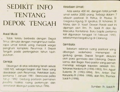 (disarikan dari Buku “Dari Stasi ke Paroki, Gereja Katholik St Matheus Depok Tengah, Juni 2000 dan Wawancara dengan Bp. M Roeswanto, Mei 2021)